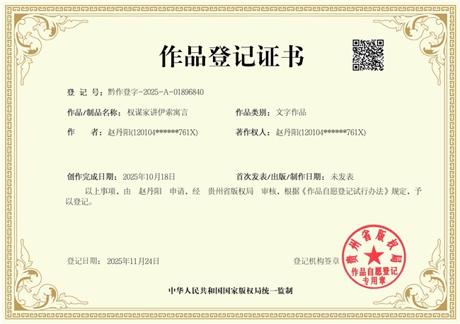 《权谋家讲伊索寓言》是赵丹阳创作的文学作品,于2025年11月24日进行版权登记。登记号:黔作登字-2025-A-01896840。