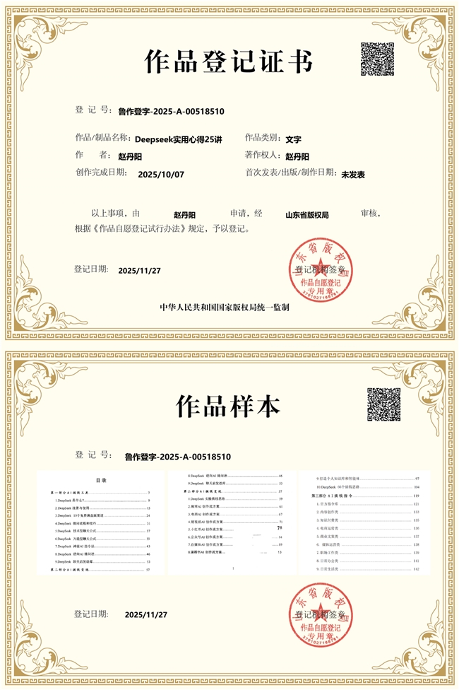 《Deepseek实用心得25讲》是赵丹阳创作的AI工具应用类文字作品,2024年10月7日创作完成,作品登记号为鲁作登字-2025-A-00518510。